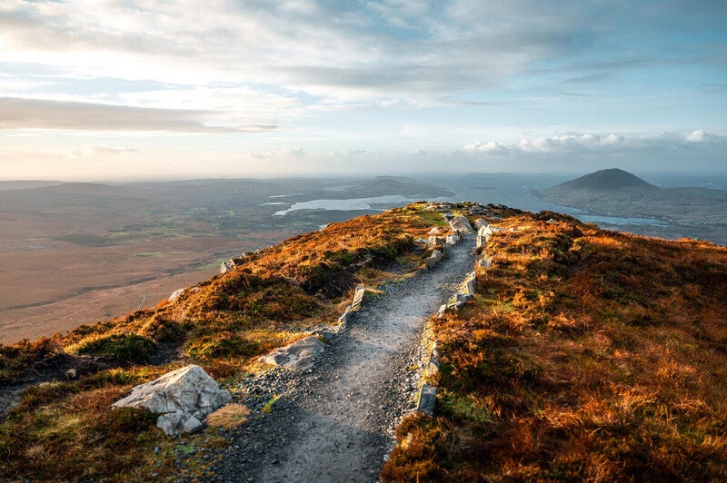 Rising above the rugged landscape of Connemara National Park, Diamond Hill offers one of the most rewarding walks in the west of Ireland. Its well-maintained trails lead through blanket bog and heathland to a summit with breathtaking panoramic views.